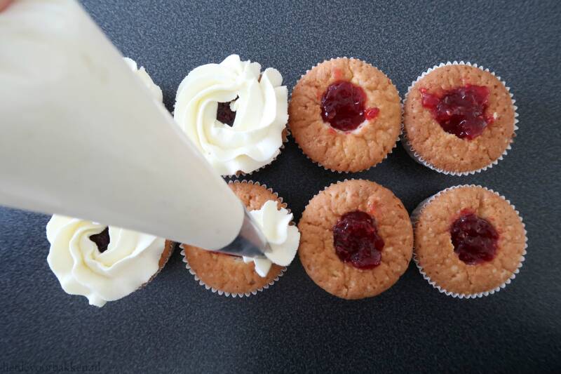 Als de cupcakes zijn afgekoeld, maak je met een lepeltje (wij gebruiken een meloenlepeltje) een rond holletje in de cake. Deze vullen we dan met jam.