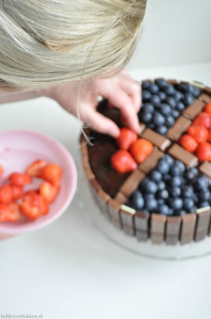 Dan plak je de Mercietjes rondom op de zijkant van de taart. Verdeel met een paar Mercietjes de bovenkant in vier vlakken. Vul de vlakken op met de aardbeien en de bosbessen.