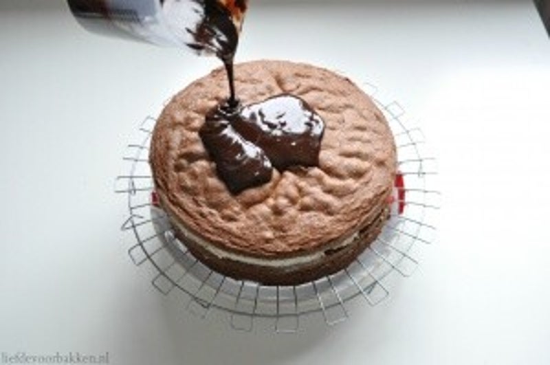 Zet de taart op een taartrooster met een opvangbord er onder. Giet de vloeibare chocolade over de taart. Zorg dat de hele taart bedekt is met de chocoladeganache. Laat even staan zodat de chocolade al ietsje steviger wordt, maar uiteraard nog wel plakt.