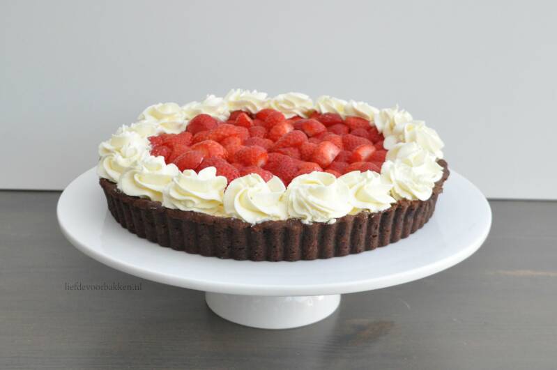 Deze vlaai heeft weer eens een lekkere chocoladebodem. die hebben we al eens eerder gemaakt bij de chocoladevlaai. Hij is erg lekker en de combinatie met aardbeien is heel goed! Voor de vulling kiezen we voor een mascarpone-aardbeiencrème. Dan die heerlijke aardbeien er op en toefjes slagroom voor de afwerking! Zo creëer je een heel mooi plaatje.