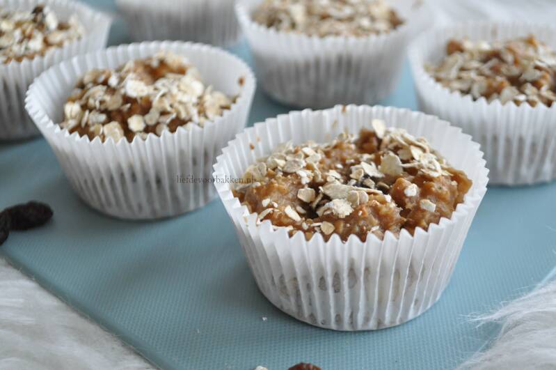 - Doe de bakingcups in de bakvorm voor cupcakes en vul ze met het beslag. Je kan er eventueel nog wat losse havermoutvlokken overheen doen, dat geeft een beetje een rustiek effect.