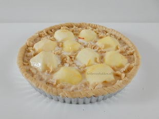 - Giet dan de marsepein-topping er overheen, tussen de appeltjes en de kruimels deeg.