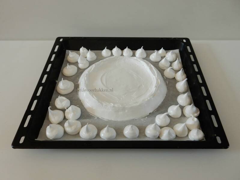 - Maak de ronde merengue bodem voorzichtig los van het bakpapier. Leg deze op een taartschaal.