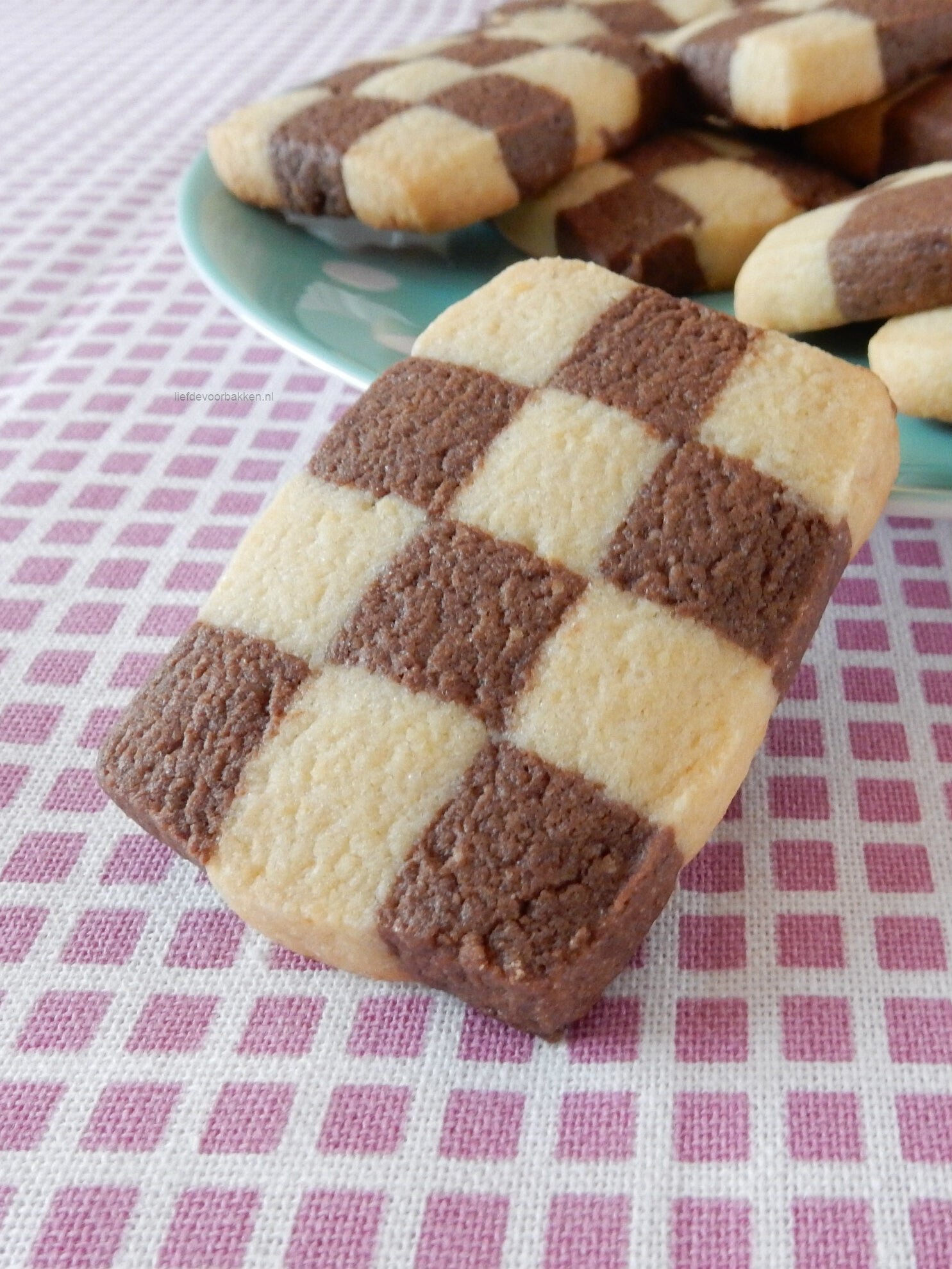 Deze koekjes heb ik al vaker gezien, maar nog nooit gemaakt. Altijd leuk om iets nieuws te proberen! De koekjes zijn gemaakt van zanddeeg in twee kleuren. Dit krijg je doordat er cacaopoeder aan een deel van het deeg is toegevoegd. Het lijkt ingewikkelder dan het is, maar het valt eigenlijk reuze mee. Je snijd je deeg straks in repen, die je om en om naast elkaar plakt. Daardoor krijg je een blokjes patroon. Dan snijden we er koekjes van. Je kan er ook nog voor kiezen om ze dan alsnog uit te steken, zodat je leuke vormen krijgt! Laten we snel aan de slag gaan!