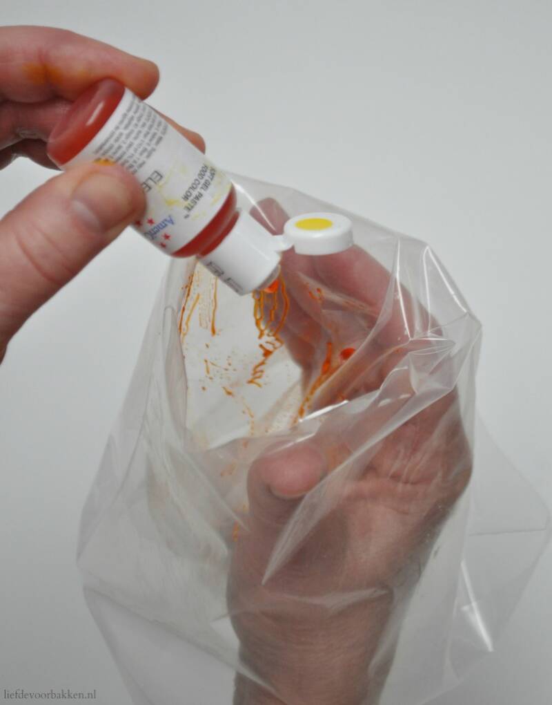 Ik heb gele kleurstof voor chocolade gebruikt om de witte chocolade geel te maken. Dat gaat goed. Voeg een paar druppels van die gele kleurstof toe aan de chocolade, roer door en kijk zelf even hoe geel het moet worden.