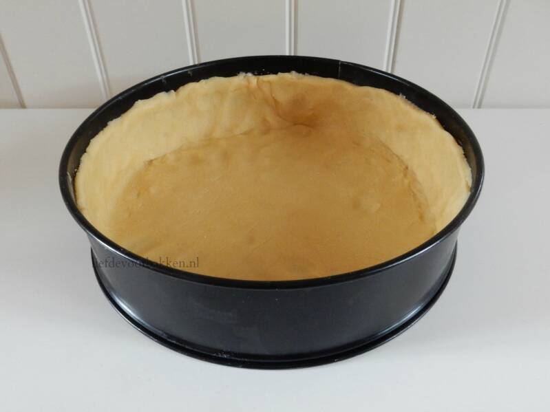 - Deel het deeg op in 3 stukken. Gebruik twee delen voor de bodem en één deel voor de bovenkant. Rol het deel voor de bodem uit tussen twee stukken plastic folie. Zorg ervoor dat de lap een stukje groter is dan de bodem, zodat je er ook de zijkanten voor een deel mee kunt bedekken. Haal het plastic van de bovenkant en til de lap op met behulp van het onderste plastic. Bedek de bodem en de zijkanten ermee. Zorg dat het deeg gelijkmatig verdeeld wordt. Zet het bakblik met het deeg een kwartiertje in de koelkast.