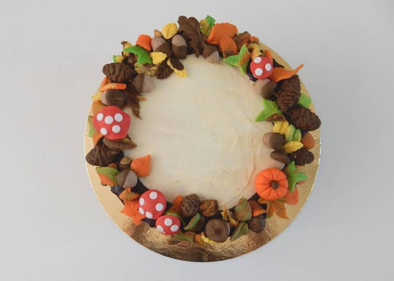 - Als de chocolade een beetje uit hard, kun je alvast beginnen met het maken van de decoratie, zoals paddenstoelen, blaadjes, eikeltjes, dennenappeltjes, pompoenen enzovoort. Maak deze van marsepein of rolfondant. Gebruik hiervoor restjes van verschillende kleuren. Voor de blaadjes is het leuk als je wat groene, oranje en gele fondant een klein beetje door elkaar mengt. Dan krijg je mooie herfst tinten. Laat alle figuurtjes een beetje drogen en verdeel ze dan over de chocolade rand.