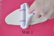 Je begint met de lussen van de strik. Pak een stukje Satin Ice Gum Paste, kneed dit goed door en rol dit uit tot een langwerpig plakje. Hieruit snijd je een rechthoekig stuk met de Wilton Fondant Ribbon Cutter. Dit zou je natuurlijk ook uit de losse hand kunnen snijden, maar het is belangrijk dat beide zijde even lang zijn. Leuk detail van de Wilton Fondant Ribbon Cutter is dat je er ook voor kan kiezen voor een gebogen wieltje, wat zorgt voor een extra leuk effect!