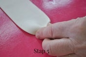 Voor de linten begin je weer met een stukje Satin Ice Gum Paste. Deze rol je uit tot een langwerpig stukje en je snijd er een strook uit met de Wilton Fondant Ribbon Cutter. Zorg dat deze stroken dunner zijn dan de stroken van de lussen, dat ziet er vaak net wat mooier uit.