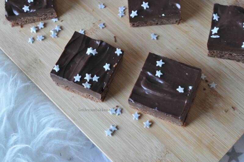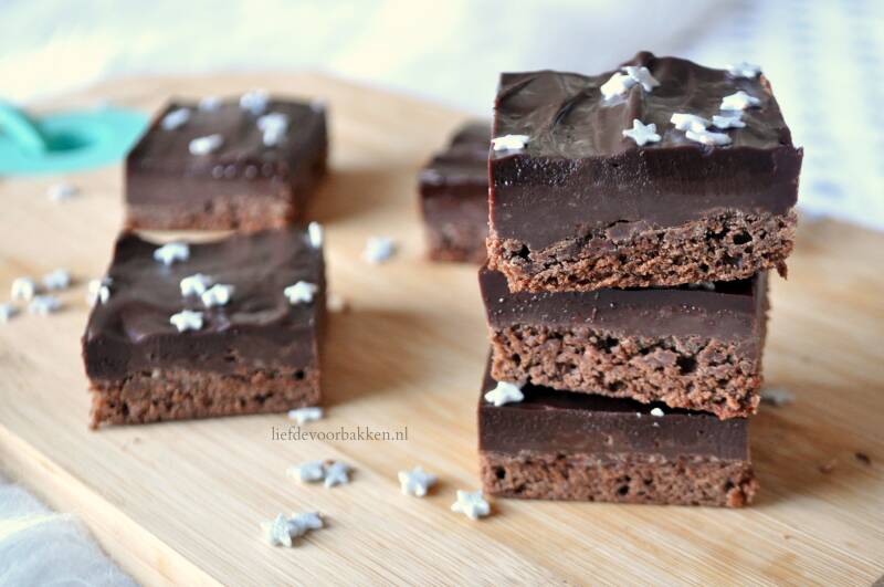 - Breng hiervoor 100 ml verse slagroom bijna aan de kook. Breek de chocolade in een kommetje en giet daar de hete slagroom overheen. Niet meteen roeren! Laat even een tijdje staan en meng dan de inmiddels gesmolten chocolade door de slagroom. Giet dit over de brownies en strooi hier zilveren sterretjes over.