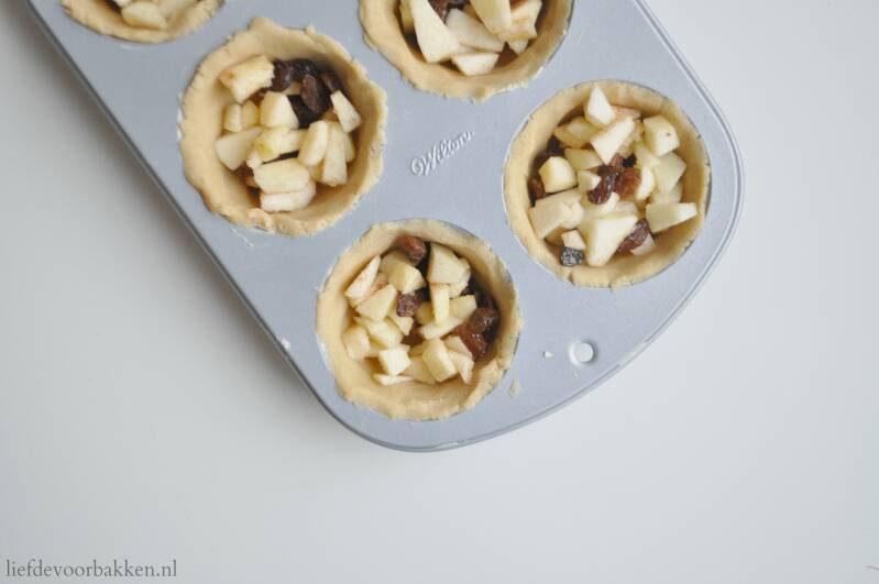 - Vul de deegbakjes met de appel-rozijnen mengsel. Doe ze goed vol, zodat je flink gevulde appeltaartjes krijgt. Dan zijn ze op z'n lekkerst!