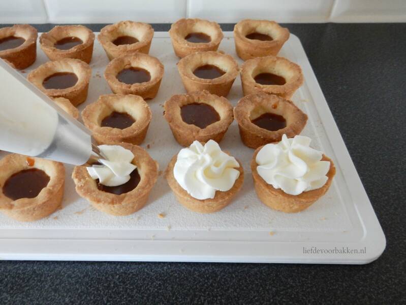 - Zet de bakvorm een half uurtje in de koelkast. Prik dan met een vork wat gaatje in elke bodem en bak de bakjes dan in een voorverwarmde oven gaar op circa 180 graden in circa 15 tot 17 minuten. Let op, want elke oven is anders. Als ze mooi goudbruin zijn is het goed. Houd ook in de gaten of de bodem wel goed gaar is, anders nog heel even een paar minuutjes er in laten staan terwijl de oven al uit is.