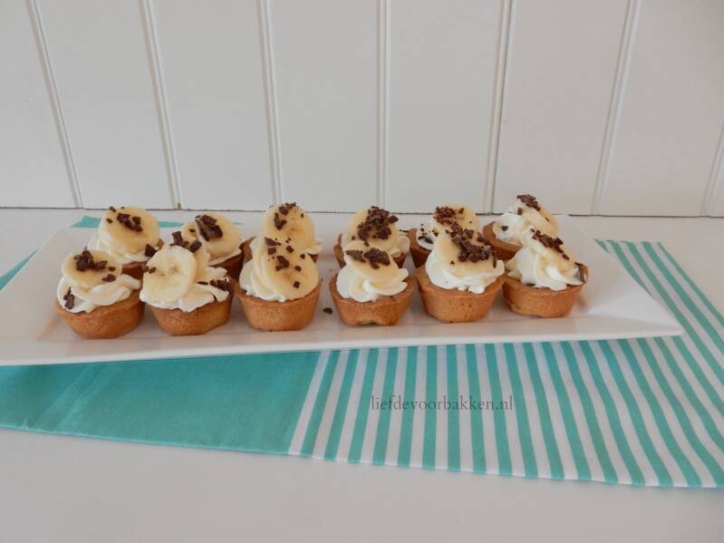 Ik wil al heel lang een keer een banoffee pie maken. Daar is nog niet van gekomen. Toen zag een keer ergens dit idee, en daar heb ik een receptje bij bedacht. De kleine bakjes zijn gemaakt van zanddeeg, met behulp van een bakvorm voor minicupcakes. Voor de vulling maak je zelf karamelsaus. Verder heb je slagroom, bananen en een klein beetje chocoladevlokken nodig. Al met al is dit niet zo heel veel werk. Erg leuk ook voor op een high tea, omdat het maar een klein hapje is.