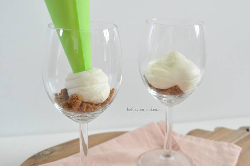 - Begin met het fijnmalen van de Lotus speculooskoekjes. Dat zijn van die smalle koffiekoekjes van Lotus. Ik heb 3 koekjes per persoon gerekend. Maal ze fijn met een staafmixer en doe in een schaaltje. Smelt de 20 gram margarine in een steelpannetje en giet het over de fijngemalen koekjes. Schep dit door elkaar en zorg dat het een kruimelige massa wordt. Verdeel dit over de bodem van de 4 wijnglazen. Houd een beetje crumble achter om op het laatst nog als topping te gebruiken.