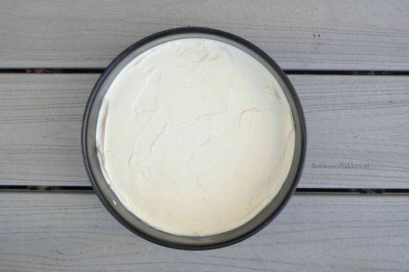 - Verkruimel voor de bodem de koekjes tot een fijngemalen massa. Dit kan bijvoorbeeld met een staafmixer. Smelt de boter in een pannetje en voeg hier de fijngemalen koekjes aan toe. Vul de springvorm met je bodemmengsel en druk het deeg goed aan. Laat het opstijven in de koelkast.