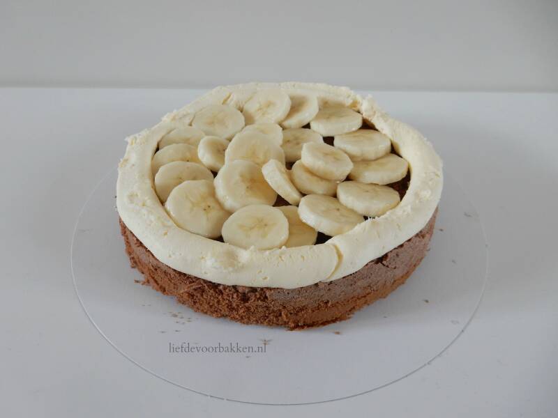 - Leg daar de tweede laag op. Spuit weer een ring van botercrème, en schep hierin een laag mascarponecrème. Dan weer een laag biscuit er op. Ook hier spuit je een ring van botercrème, daarin dan weer een laagje banaan. Snijd hiervoor de tweede banaan in plakjes en vermeng weer met citroensap. Schep even goed door en leg de plakjes dan op de derde biscuitlaag. Smeer hier nog een beetje mascarponecrème op.