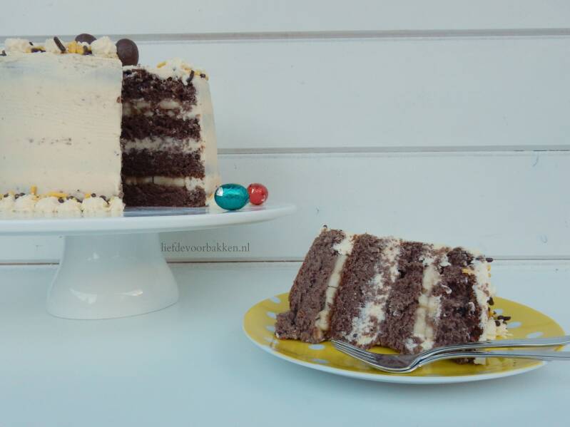 Dit taartje is gemaakt van chocoladebiscuitdeeg. Lekker licht dus. Ik heb een klein, hoog taartje gemaakt. Weer eens wat anders. Daarvoor wilde ik 4 lagen biscuit hebben. Ik heb hiervoor twee bakvormen gebruikt. Daardoor hoef ik maar één keer te bakken. Als je die niet hebt, bak je het in twee keer. Als vulling heb ik gekozen voor een marscapone-advocaat crème. En twee laagjes banaan! Yummie! En dan natuurlijk een decoratie die bij Pasen past! Kijk hoe wij het hebben gedaan, maar als je een ander decoratie ideetje hebt, kan dat natuurlijk ook. Leef je lekker uit!!