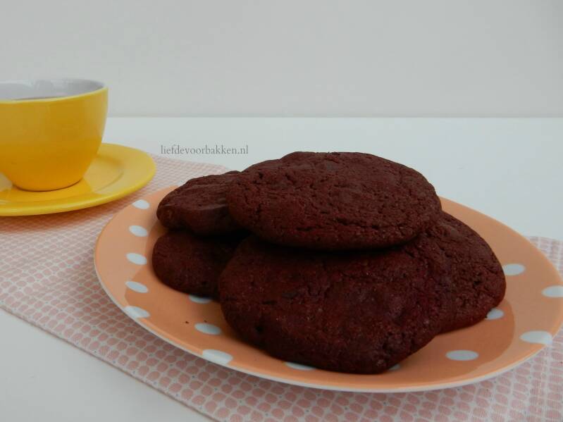 Op het station, in zo 'n Kiosk op het perron kochten we thee met een koek. Ze hebben altijd van die lekkere grote chocolate chip cookies, maar nu was er een Redvelvet variant! Nou die hebben we geprobeerd, heerlijk! Dus ja, dan kan ik niet achter blijven. Die moet ik natuurlijk zelf ook maken. Dus dat heb ik nu gedaan! Smaakt natuurlijk weer heel erg goed.