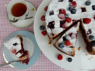 - Haal uit de oven en laat afkoelen. Haal dan de rand van de springvorm er af. En zet de taart dan heel voorzichtig op een taartplateau. Let wel op: de taart is door de grote hoeveelheid vulling wel wat kwetsbaar. Dus voorzichtig overbrengen op het bord. Dan nog wat poedersuiker er op en garneren met wat verse vruchten.