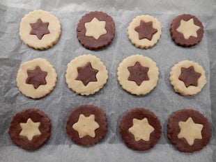- Rol van beide stukken deeg een lap uit. Je kan het eventueel met wat huishoudfolie bedekken als het erg plakt. Dit was bij ons niet nodig. Steek met de ronde of gekartelde ronde uitsteker de koekjes uit. Steek dan uit elk koekje weer een ster uit. Wissel deze sterren om, zodat er in het lichte koekje een donker ster komt te zitten en in het donkere rondje een lichte ster. Maak zo al het deeg op. Rol met een roller nog even heel voorzichtig over de koekjes zodat ze niet ongelijk worden.